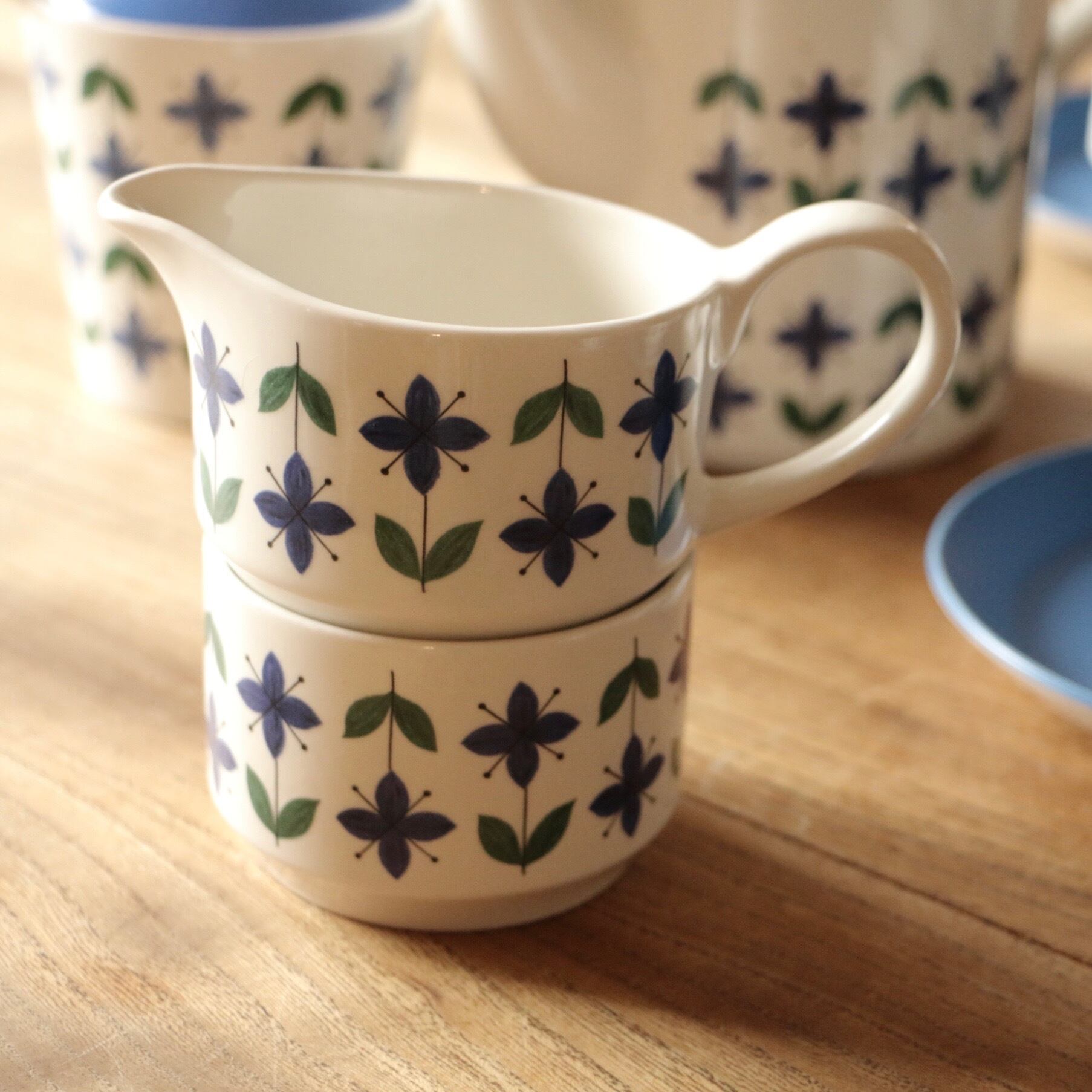 ややマットで爽やかなブルーの小花のデザイン「roselle」シリーズのミルク&シュガーのセット。小ぶりで使いやすいですよ!
